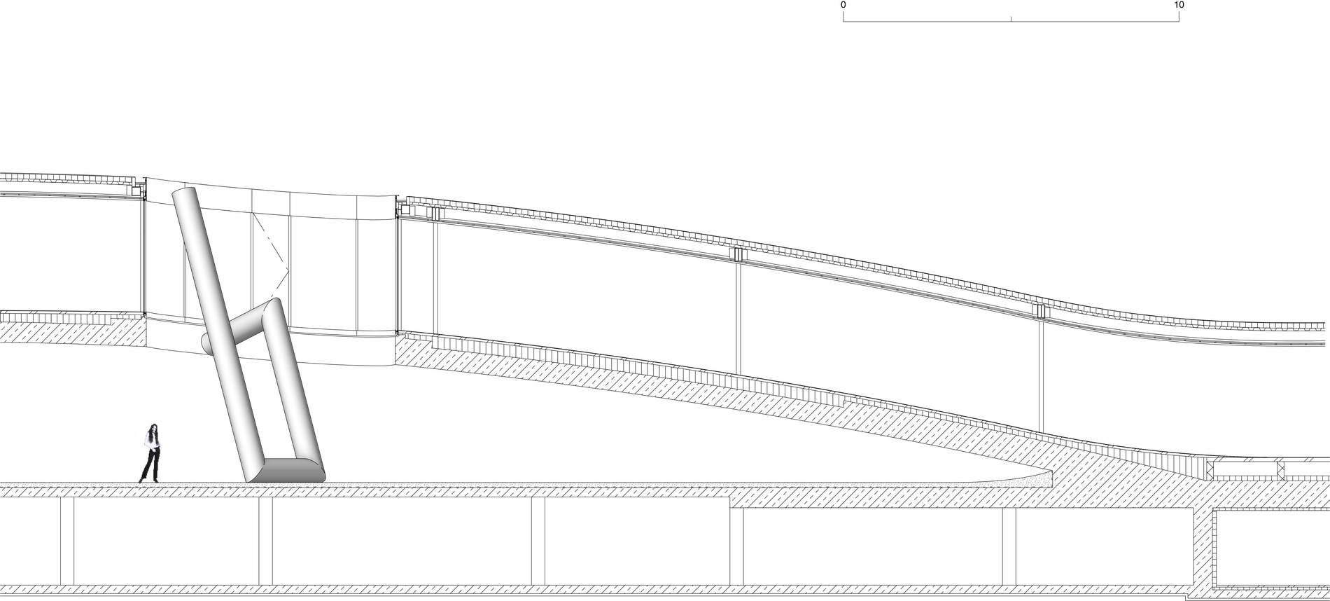 But unlike works that tend to fill atriums (where they can be viewed like museum exhibits in a glass shell), Up #4 displays an interesting behaviour. It is not a pure presentation piece, contactless and passive (even though you might get the impression that someone tipped it over at some point). Rather, the sculpture leans against the wall, tilts towards it, wants to scan it and get a feel for it. The bent limb nudges – very carefully – the lower concrete edge of the round building incision at a height of about 4.5 m. The other limb is linear and ends at the upper edge at a height of almost 9 m, without protruding above the building, but still at a distance and free of it. With its posture and gestures, L/B’s sculpture reveals an ability that the undulating building demonstrates: And that is the moving gesture.