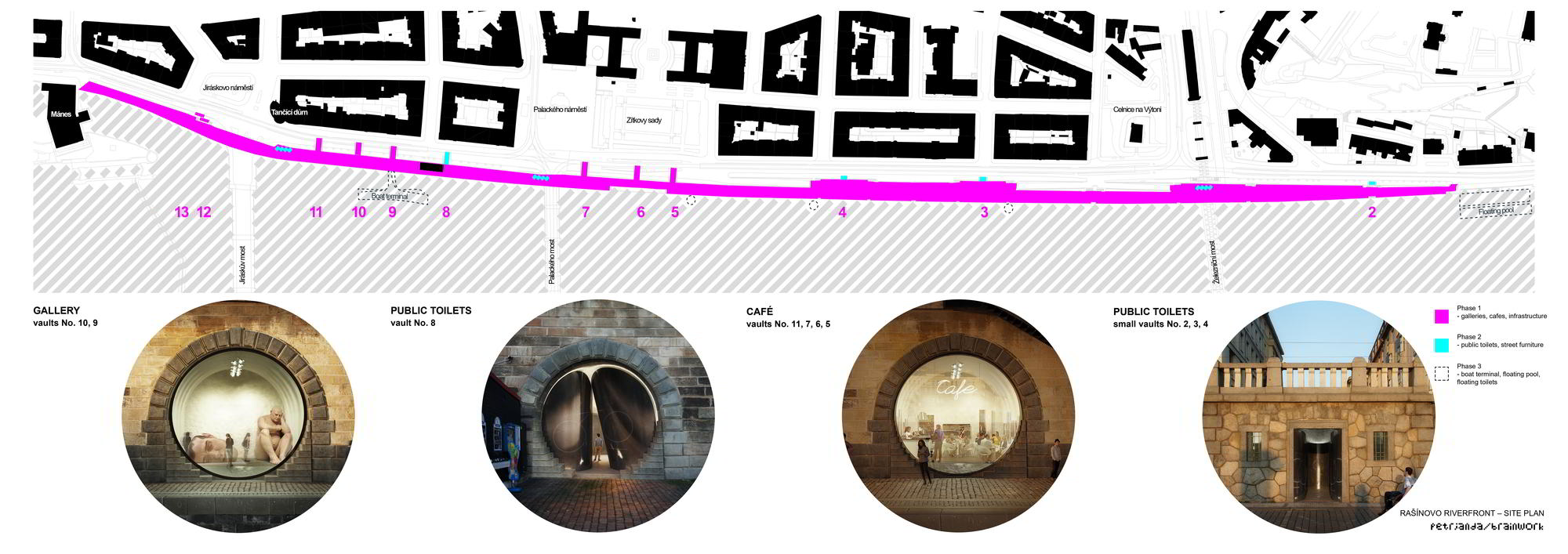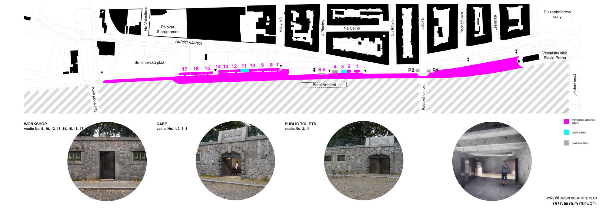 Petr Janda / brainwork gestaltet drei Uferzonen an der Moldau. Das Projekt veredelt ehemalige Kerkerzellen in kulturelle Nischen