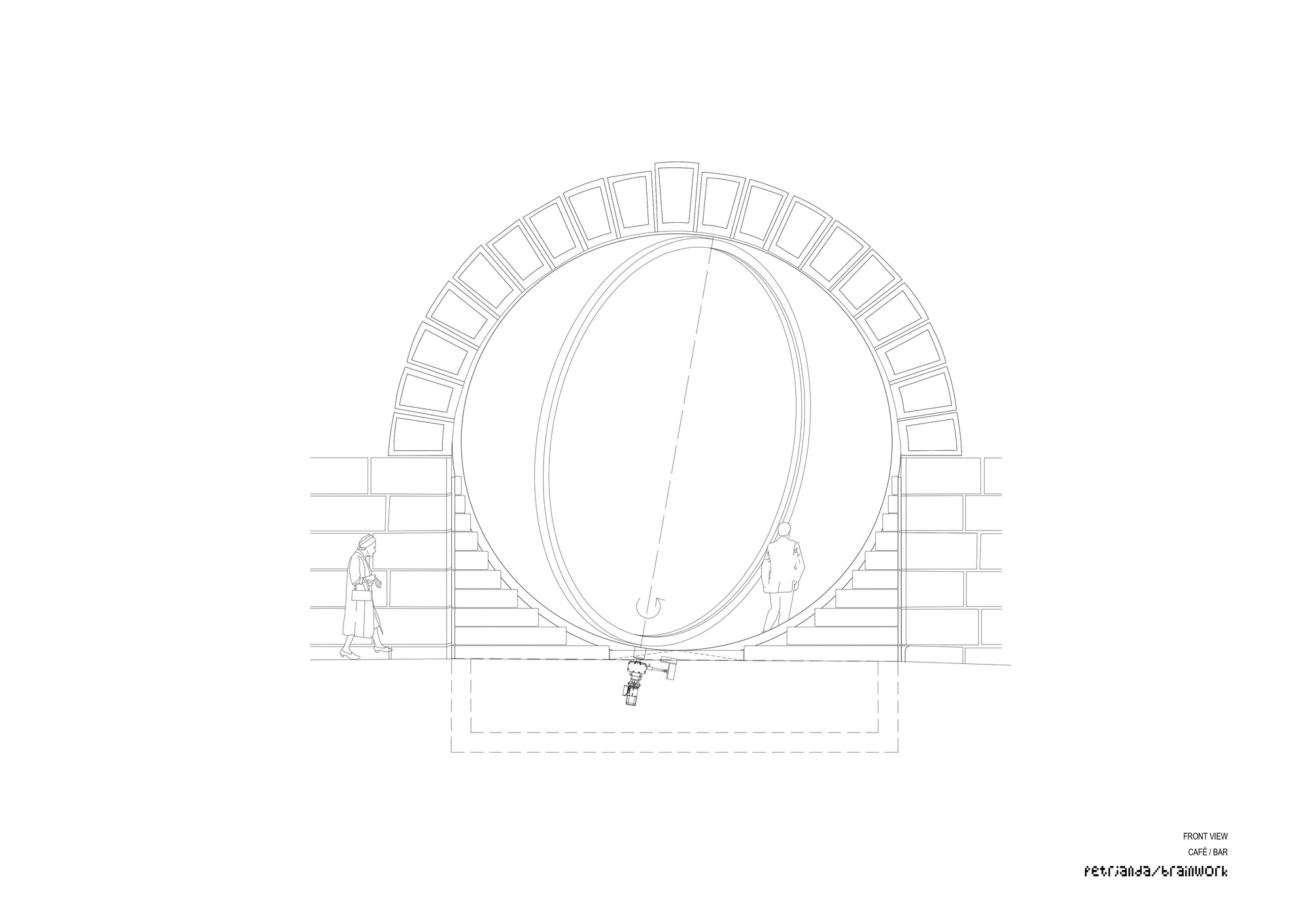 First of all, there are entrances consisting of stone arches, which the architect has formulated into a circle. For this purpose, he fills the arches – in the outer area and where they merge vertically into the ground – with steps. These are almost as deep as the reveal and are suitable for use as seating alcoves or as climbing frames for children. (Yet, the „stair element“ is not only decorative but also contains a technical interior comprising an installation shaft, air conditioning ventilation opening and flood protection elements – all of which are offshoots of the technical finishing of the interior).