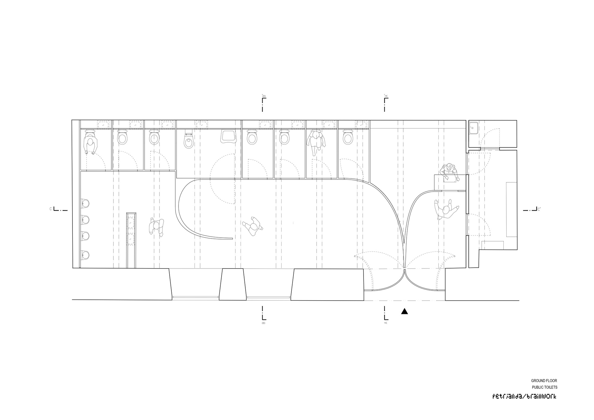 Auch im Innern profiliert sich der Entwurf durch Abwechslung, die jedoch in eine einheitliche Formensprache gepackt ist. Das Raumprogramm reicht von Cafés, Bars über Galerien, DIY-Werkstätten bis hin zu öffentlichen Toiletten. Sogar eine Leihbücherei ist eingeplant – eine Idee, die entfernt an die Bouquinisten der Seine erinnern könnte. Die sandgestrahlten Betonoberflächen bilden zusammen mit den weichen Gewölben oder gekrümmten Stahlwänden einen archaischen Rahmen. Umso mehr kommen die frappanten Interieurelemente zur Geltung. Wie künstlerische Werke statten sie die Räume aus: so etwa die schwarzen, titanbeschichteten Edelstahlbleche der Trennwände, die zu visuellen Verzerrungen und zum Eindruck des Verschwimmens führen. Auch gibt es spiegelgleiche Wände, die mit einer monolithischen Innentreppe gleichsam ein Vexierspiel treiben. Und wenn man Glück hat, kann man die Regungen der Flussoberfläche auf den Innenwänden reflektiert sehen und beobachten wie diese Reflexion sich an einer glänzenden Theke widerspiegelt. In solchen Momenten ist die Verschmelzung von einem Objekt mit dem anderen, von Innen und Außen, perfekt. Den Wahrnehmungen der Besucherschaft bietet sich ein subtiles Panoptikum von physikalischen Effekten.